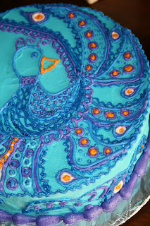 This cake was really fun as I was given so much latitude to come up with the design. All I was told was she wanted a peacock cake that served a certain number of people. I think it turned out beautifully, so did the 13 year old whose birthday it was for, and in the end that's what really counts.